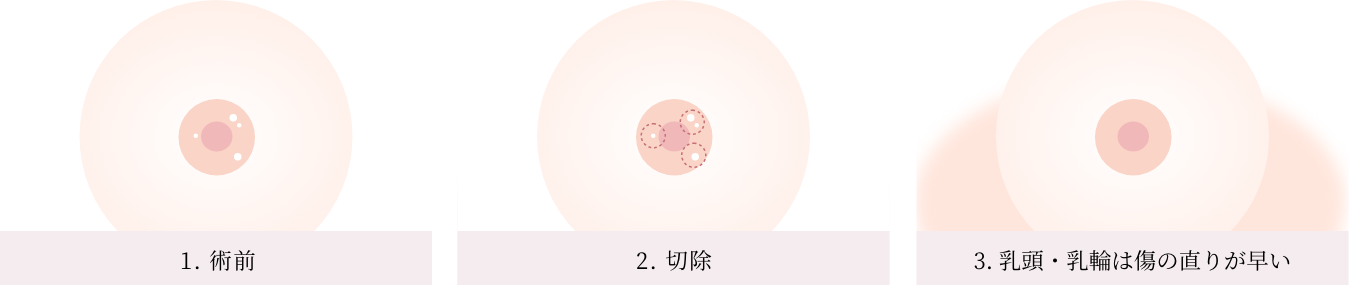 モントゴメリー腺(乳輪の周りにあるブツブツ)を美容的な観点から除去する施術です。モントゴメリー腺は誰にでも存在する皮脂腺で、通常は目立ちませんが、個人差により大きく発達したり数が増えたりして、乳輪の見た目に影響を与えることがあります。